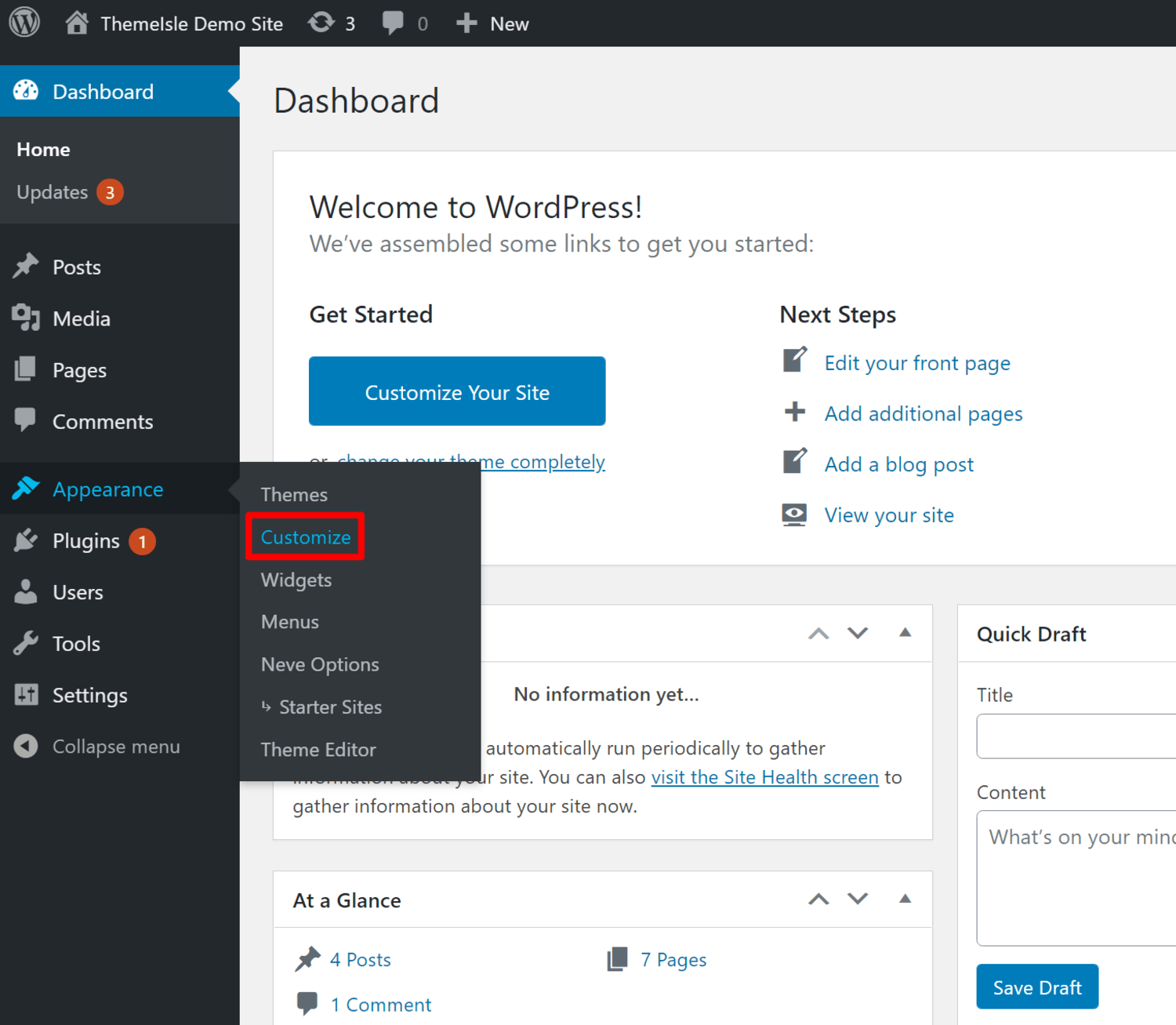 To get started, go to Appearance → Customize to open the WordPress Customizer:
